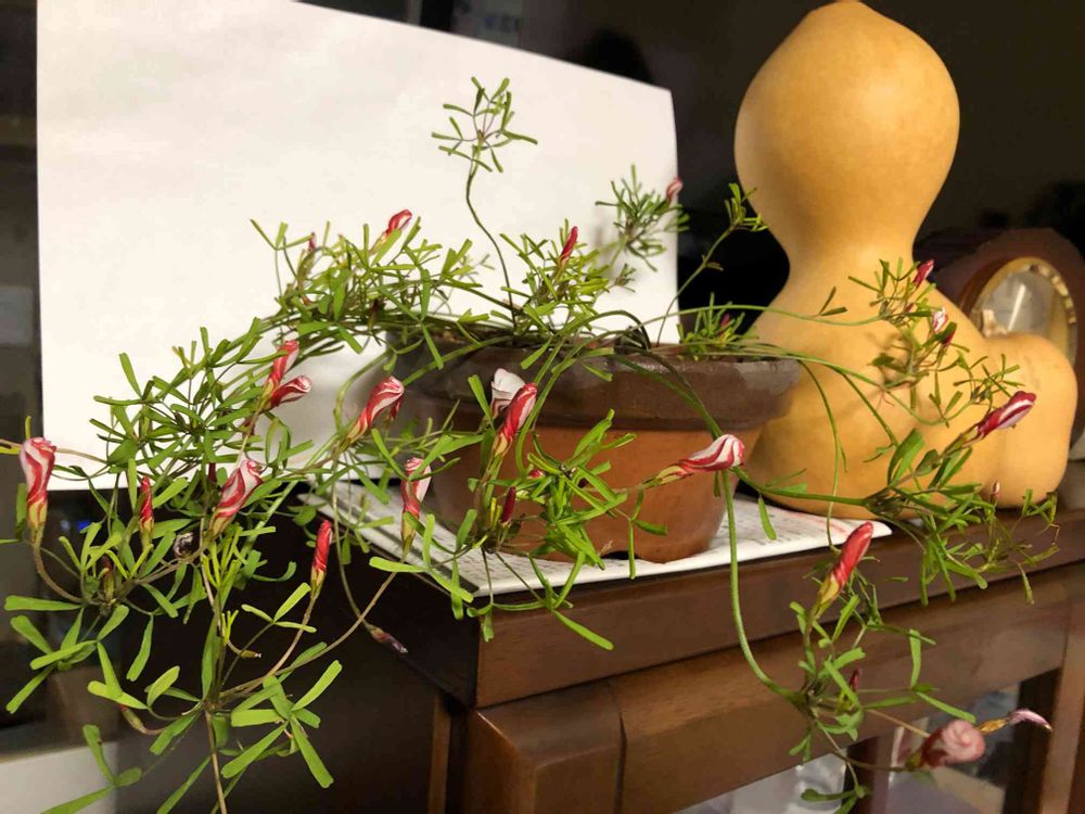 ありがとうございます。名前で検索したら、たくさん画像が出てきました。実家のは、たれさがる感じで伸びてるし一般のものとは随分と違っていました笑。放ったらかしぱなしなのでしょう😅家の中に入れたところ、帰りにはお花が咲いてました💕