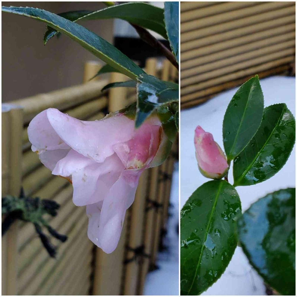 近くの緑地舗道で手折った真っ白な侘助も挿し木できないものかと😋 どれも…お天気の回復まちしてま〜す。