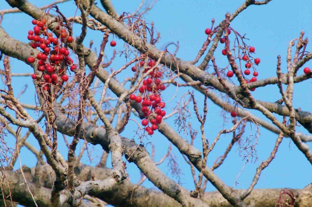 落葉後 にも ブドウの房のような 赤い実が枝に 残り 冬空に 目立つのが イイギリの 見どころ!