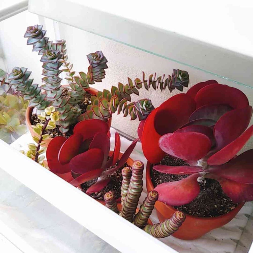 こちらは最低気温0度なんですが、水槽の中でクラッスラ達が育っちゃって、フタに当たってしまいそうです💦