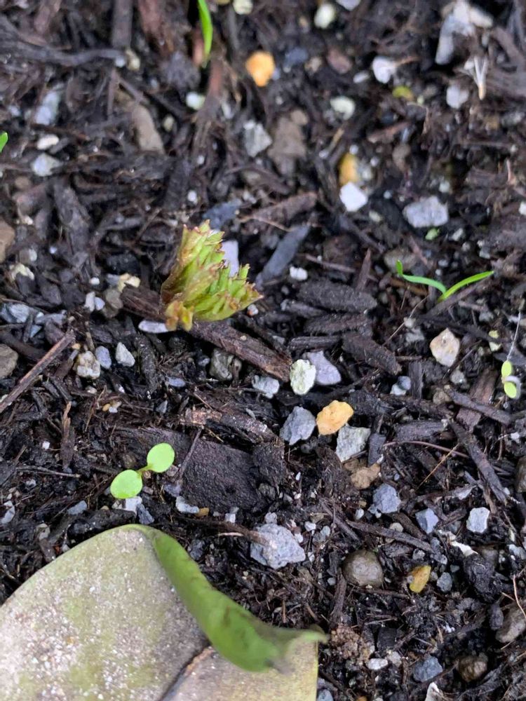 裏庭に作った花壇に植えたアネモネの球根からの発芽だと思われる芽🌱