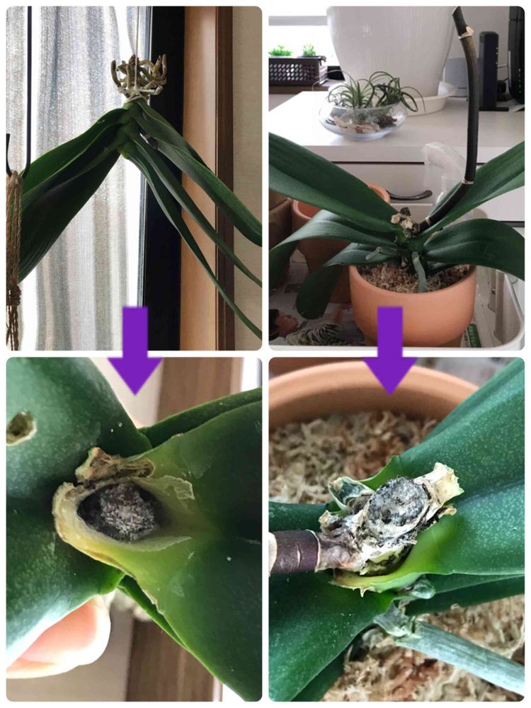 うちの胡蝶蘭も1つ成長点の新葉が止まり、下の葉っぱの付け根が開くような感じになってそこから脇芽のように伸びてきたことがあります。その時は悪い葉っぱのほうをもぎ取って新しく伸びてきたのを優先したら脇芽が入れ替わりましたよ😃