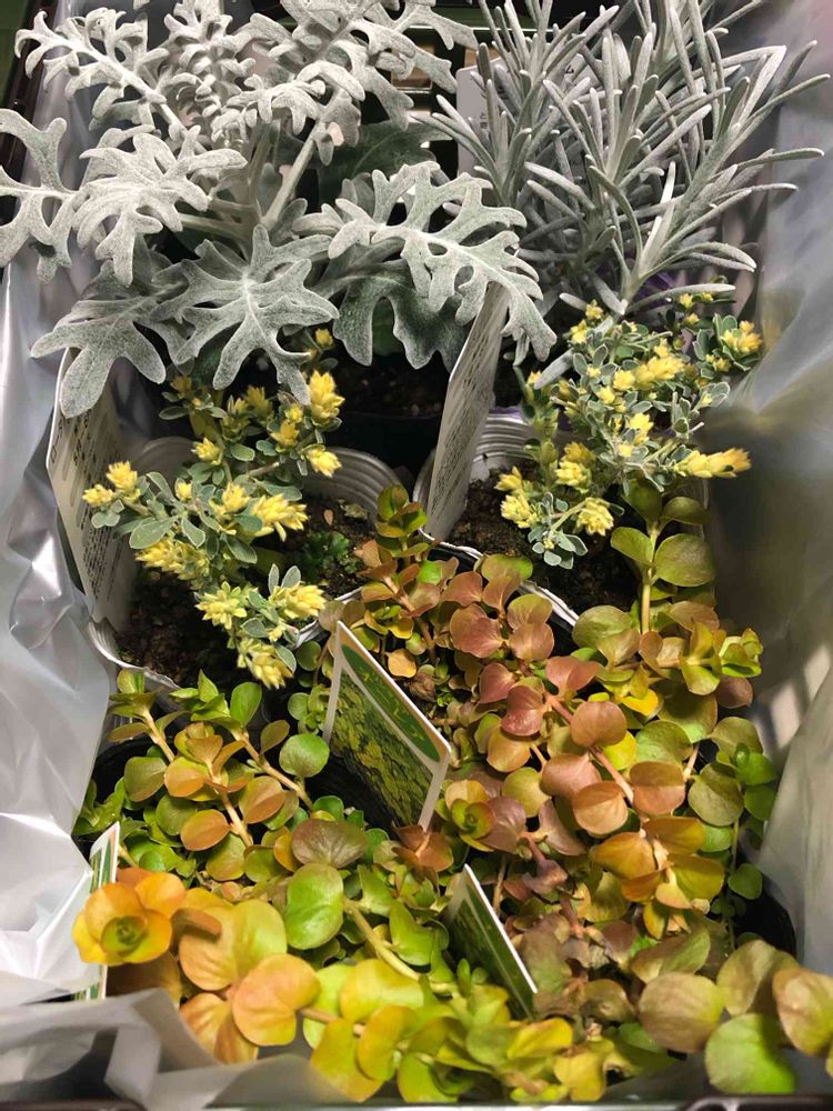シロタエギク、ヘリクリサムシルバースノー、リシマキアオーレア、そしてすごく欲しくてネットでカートに入れたままだった、ロータスブリムストーン😍やっぱり黄色の新芽が可愛い😍