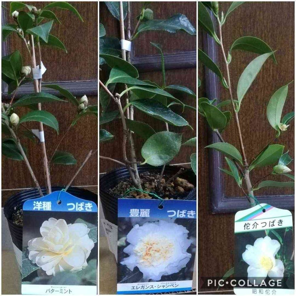 右『侘助』は欲しかったものですが…、左『バターミント』中『エレガンス・シャンペン(パン)』と食べられるような名前の椿3ポットを😋💦
