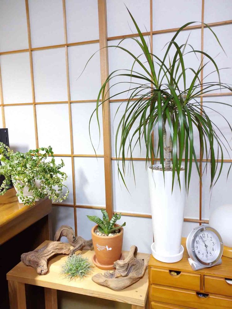 部屋には8種類置いてあるけど、これは、ドラセナ・コンシンネをメインに、流木に囲まれてサンスベリアの「ハニー」、そして、左端はフィカス・プミラ♪