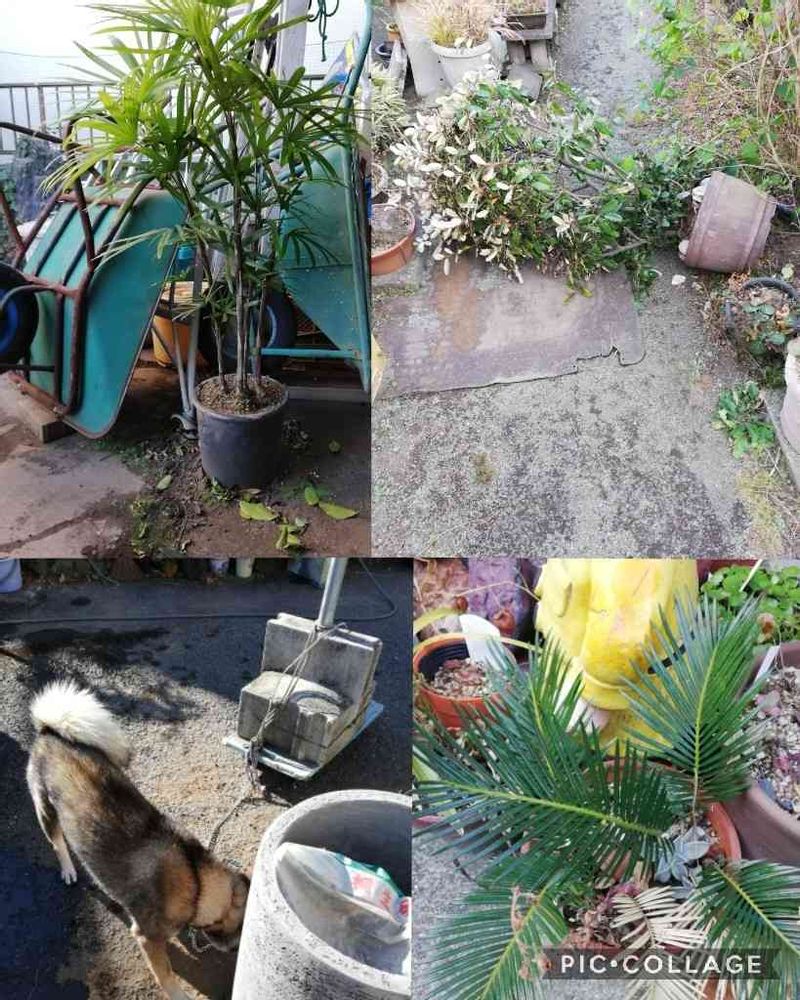 のっぽなのに 倒れないと思っていたら 大地に 根を張り出していた😅 思わず 身を隠すワンコ 小さいソテツは みんなに守られて♪