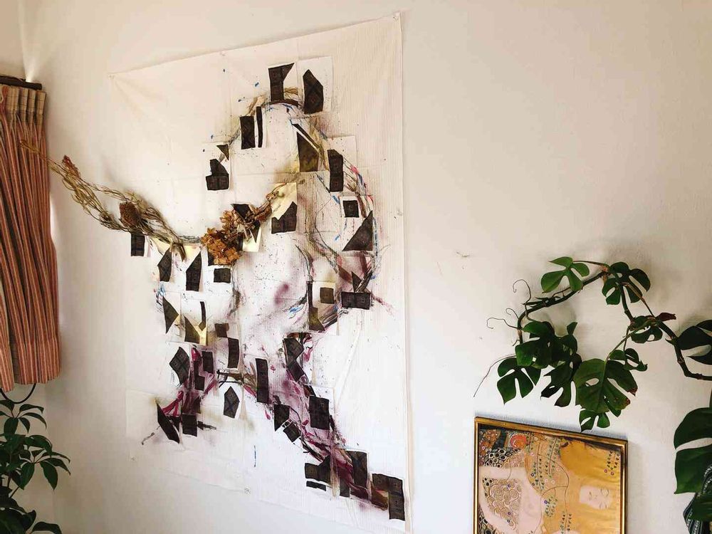 年賀状を布に貼り付けてその上から今年の干支である『丑』を描いた作品。