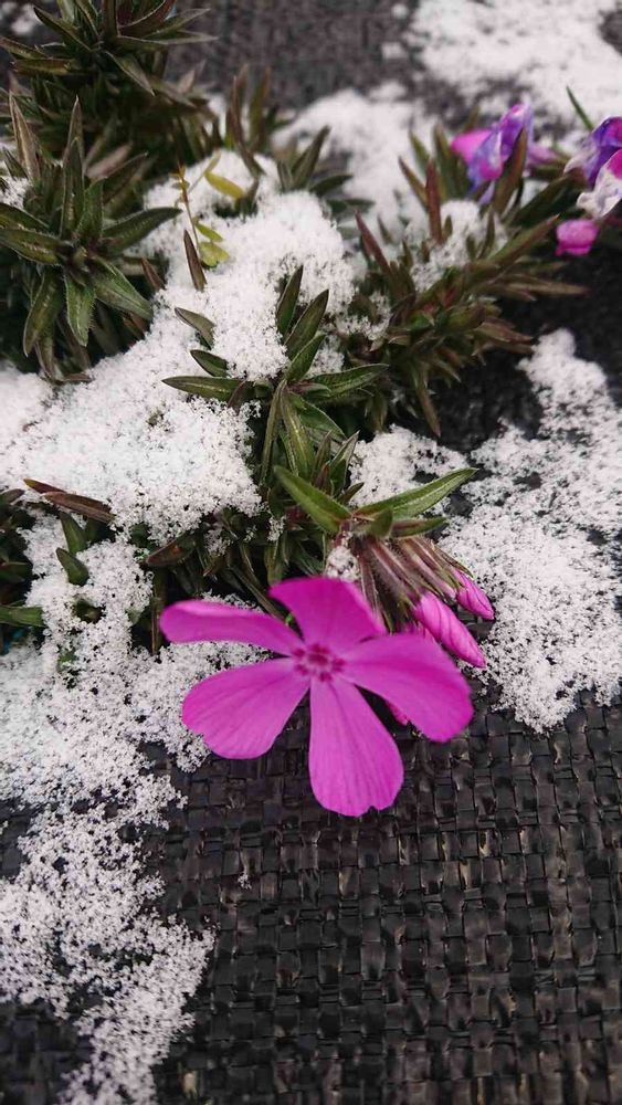 これはやっと融けかけた庭の芝桜です。🤗🎵