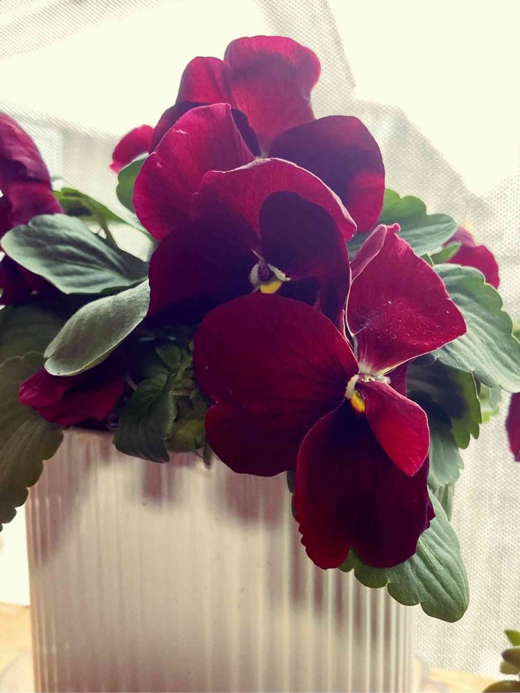 年末に豆腐屋さんで買い物した時にいただいた ✨ビオラ✨ 家の中でぬくぬく育って満開になりました🥰