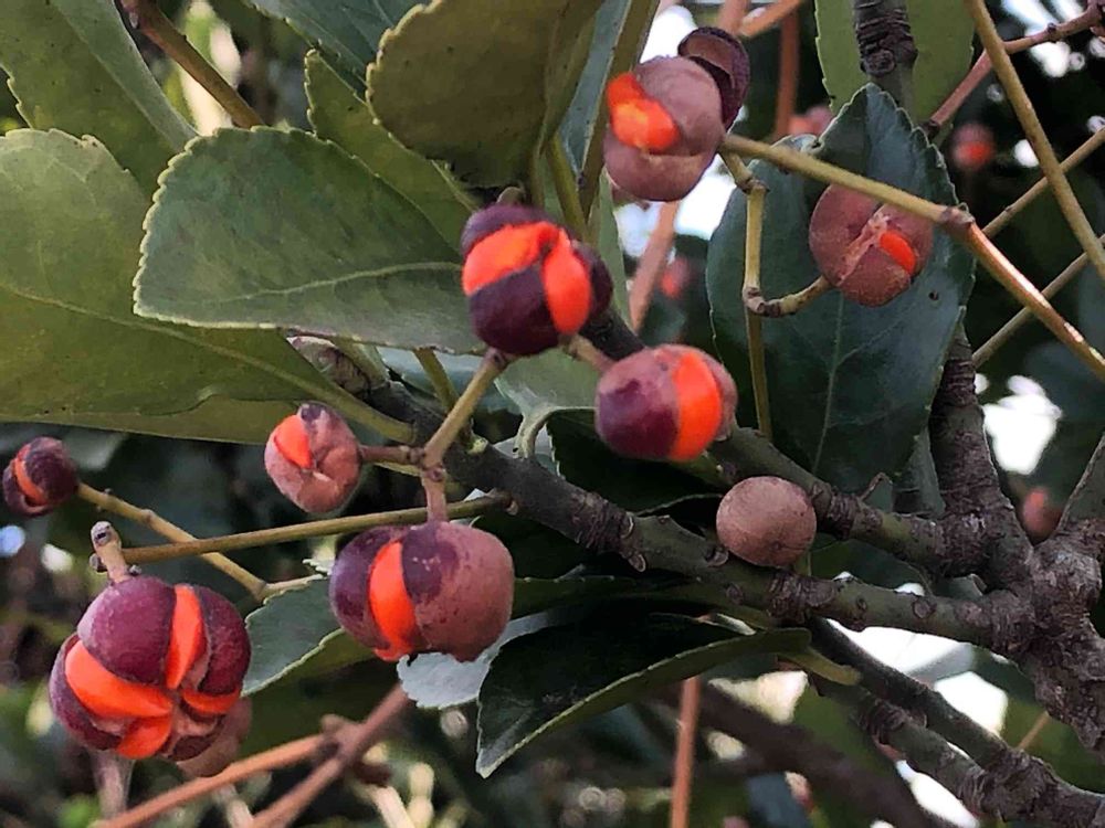 正月に横須賀の小網代の森で見つけた柾(マサキ)の実を近所で見かけました。