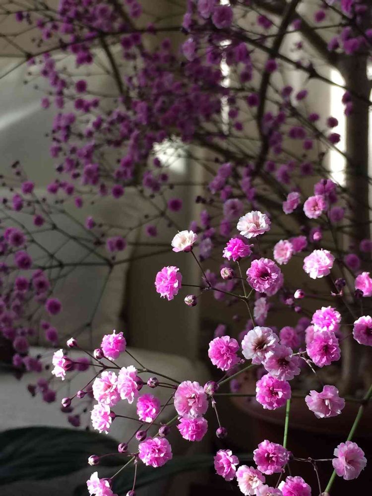 夕方、ふと見るとピンクのかすみ草の一部分に夕日が差していました✨