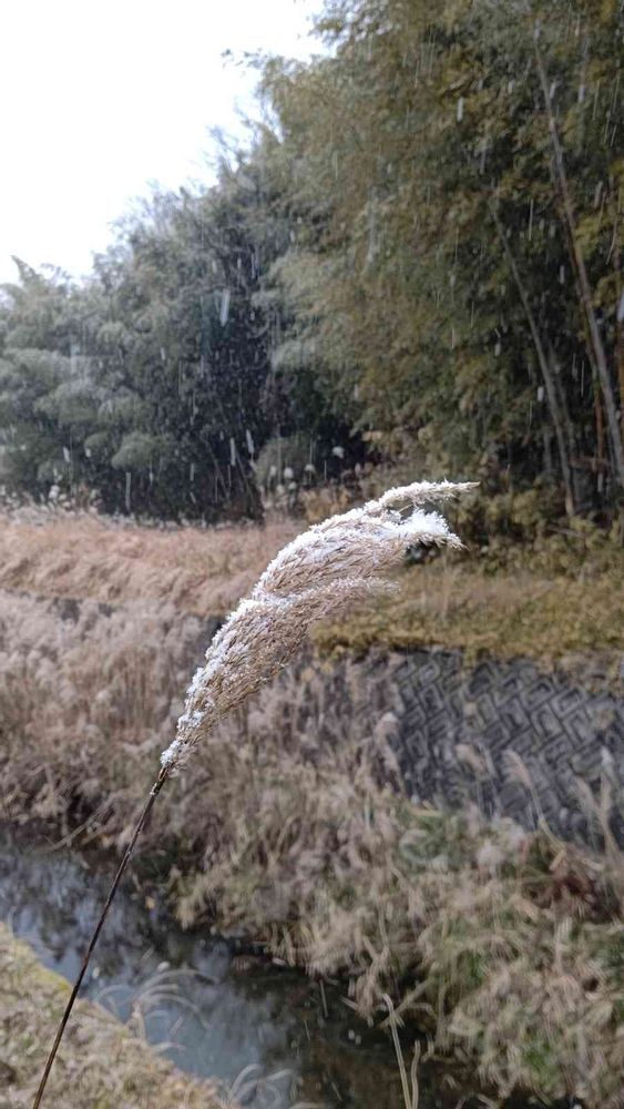 雪を被っています。田舎ゆえ茅葺きの建物がいくつかあって、このススキの枯れたものを使うこともあり。我が家では草花の保温に使おうと、夫が草刈り後のススキをたくさん運んできました(*^^*)
