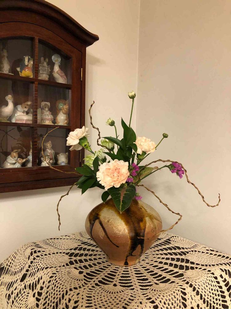 カーネーション3本、スターチスと小菊をそれぞれ一本づつ購入。しかも鮮度が低い…でも、どんな状況下でも、どんな花材でも生けたいのです。オーナーちょくちょく入院します。持病があるようです。