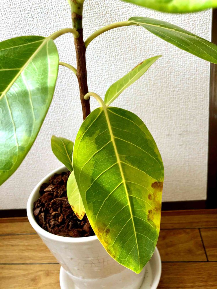 葉っぱが変色してきて😢😵、数えてみたら下から5枚も被害が出ています。冬❄️だから、水やりは極力控えめに。仕事に出る時は、カーテンを開けて、たっぷりと日射しが入るようにしているのが原因でしょうか?葉焼けなのかな?どなたか、解決法方をご指南ください、よろしくお願いします🥺🙇♀️🙇🏻。