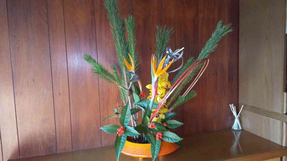 【松、ストレリチア (極楽鳥花) 千両 シンピジュウム】
