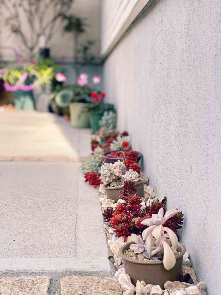 ガレージ横の無機質な場所にも多肉を配して。庇があるから霜も大丈夫。ガーデンシクラメンも同じ環境に。