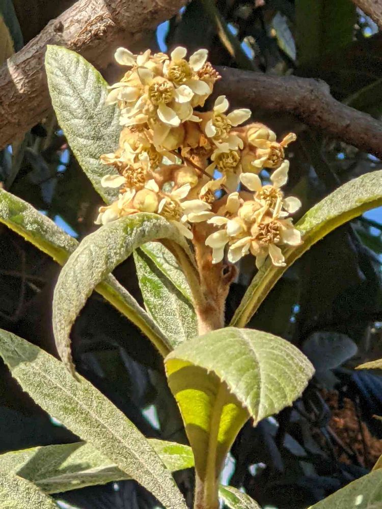 道すがら見た❗これも駐車場脇で今年初めての🌼ビワの花🌼