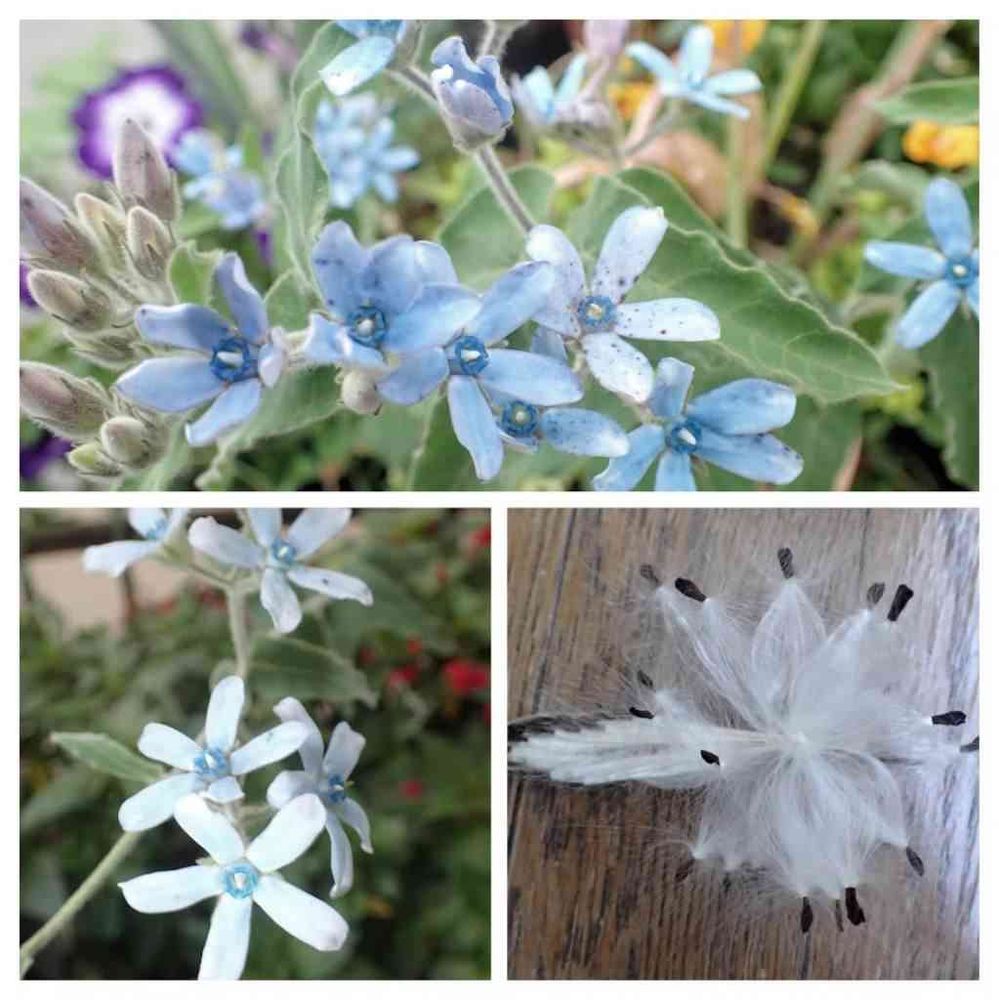 キュンキュン乙女倶楽部㊗️四周年記念(*^▽^*)~今日のお花、ブルースターです。澄んだブルーのお花がとても好き😍💙😍ガガイモ科なので、種の弾け方もよく似ていますねー、風に乗ってどこへ飛んでいくのでしょうか🎶