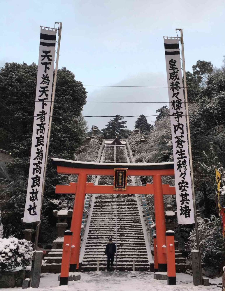 昨夜の雪が残る石段を2kmほど登り本殿へ到着しました。