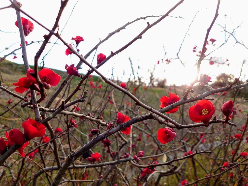 色のない景色に、木瓜の花の朱い色が目を引きました❤️