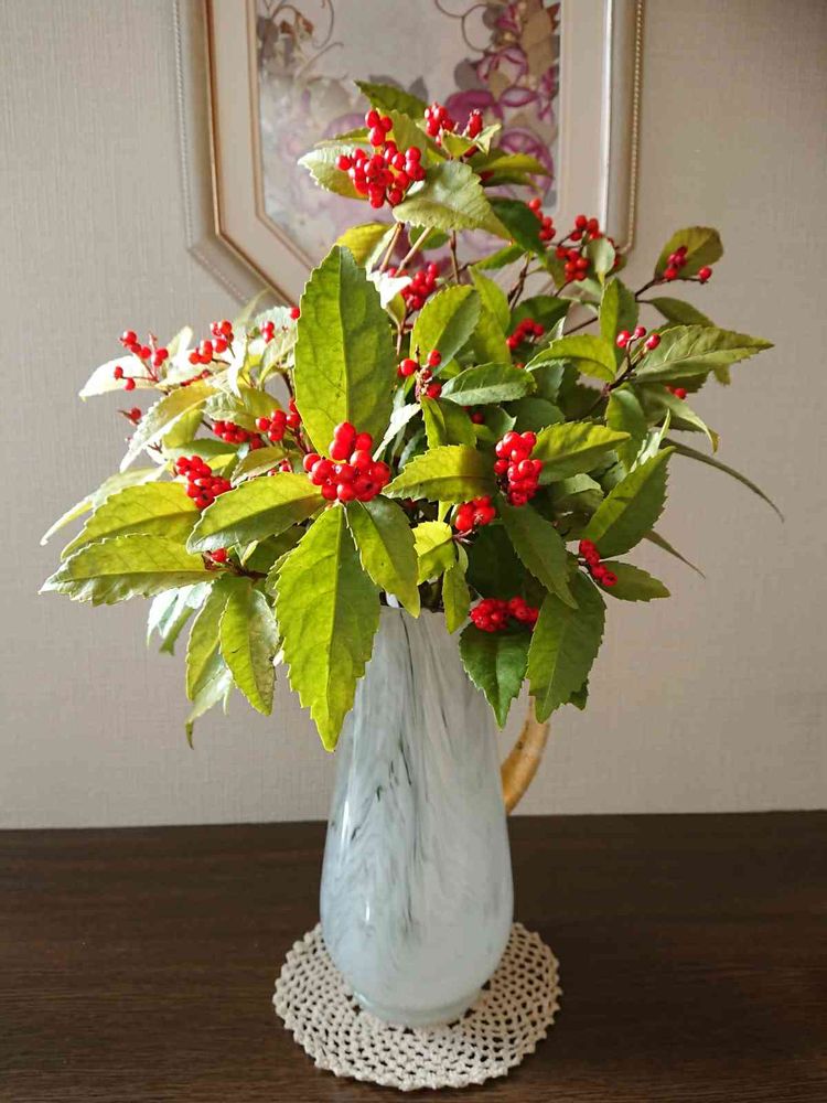 千両、赤い実が可愛くて好きなので、毎年お正月頃に花瓶にさして、ながめてます。