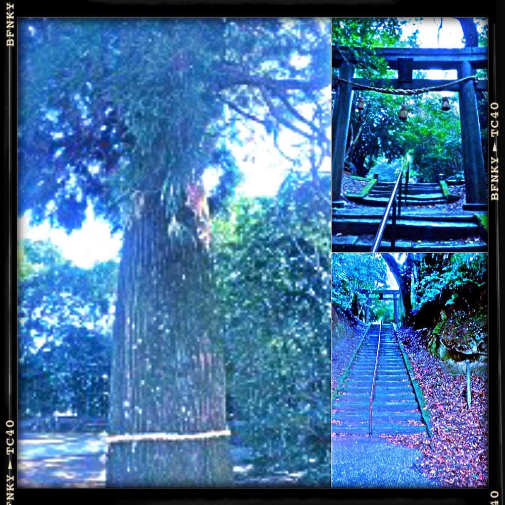 @この神社は、JR日豊本線・清武駅の東訳意600m程の辺り徒歩で約10分程、曲がりくねった坂道の中程に、神社への坂道の階段の参道があり、一の鳥居をくぐり行くと御神木の杉の木が立っています。