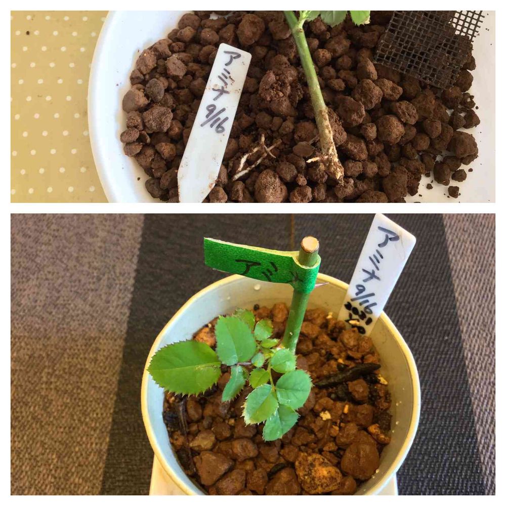 挿し穂の鉢上げ❣️全滅続きで、ほとんど諦め、存在を忘れていました。寒波襲来泥縄の防寒対策で、駐車場を片付けたら、他の挿し穂に紛れて発見❣️