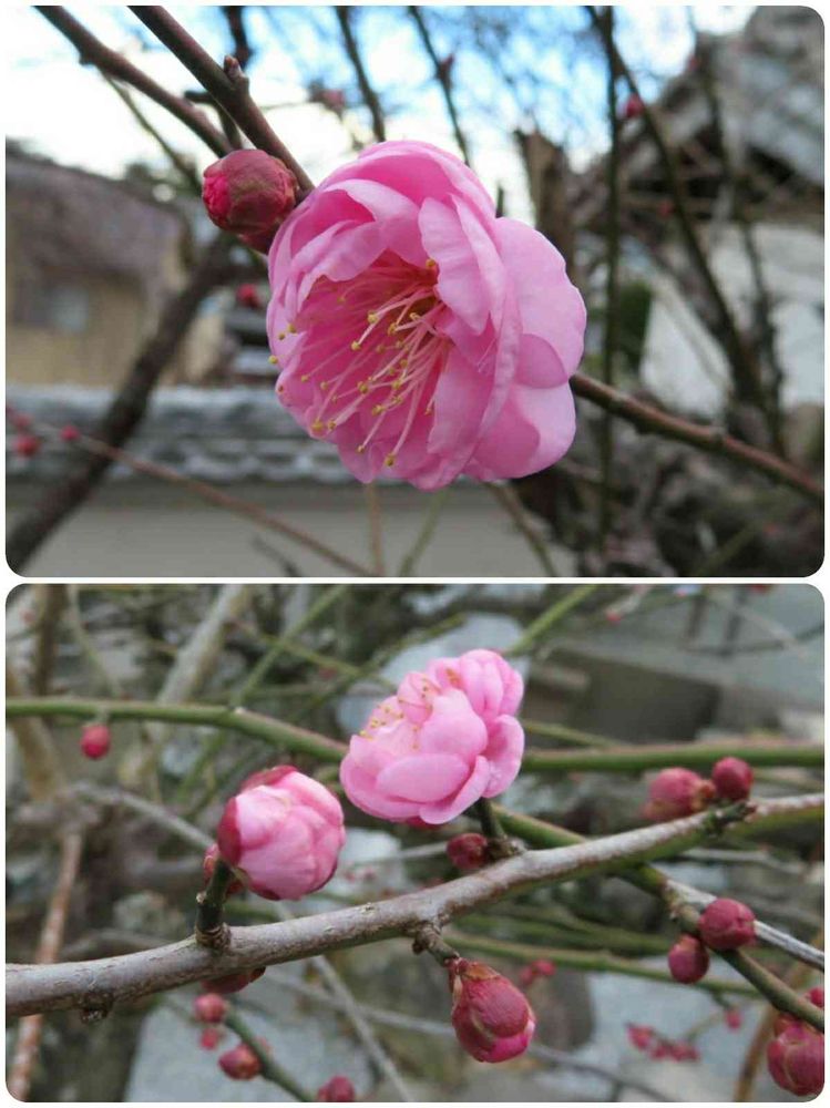 善通寺さん向いの五智院境内、この寒さのなかピンクの紅梅が咲き始めました。