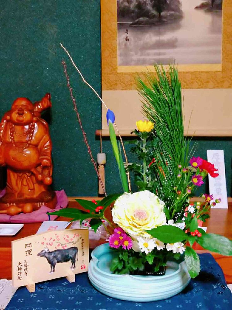 お正月らしい生け花ね〜松も千両もおめでたい㊗️華ちゃんがいけたのかな😍