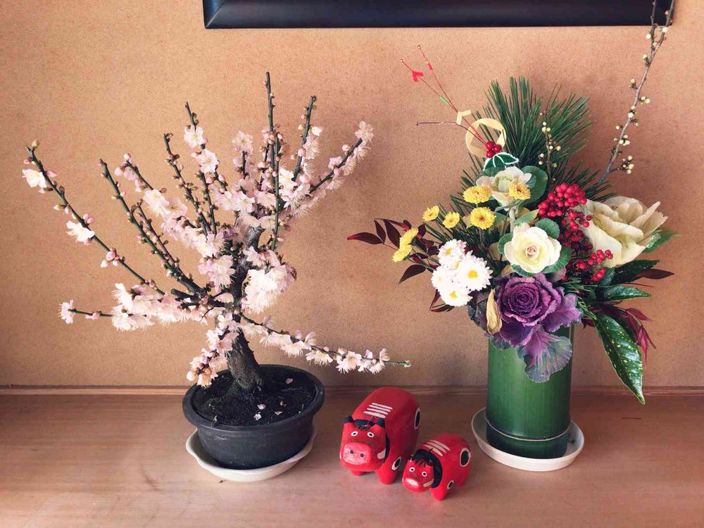 赤べこたちがお正月の寄せ植えと梅に囲まれています。いい丑年になりそうです🐮