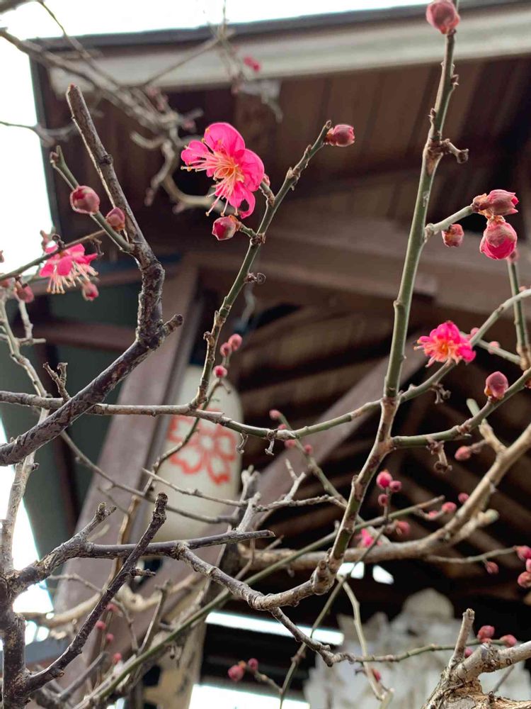 地元 縣(あがた)神社の紅梅😻チラホラ咲いています。背景は県祭りに担がれる梵天です。ちなみに御祭神は木花咲耶姫命です。