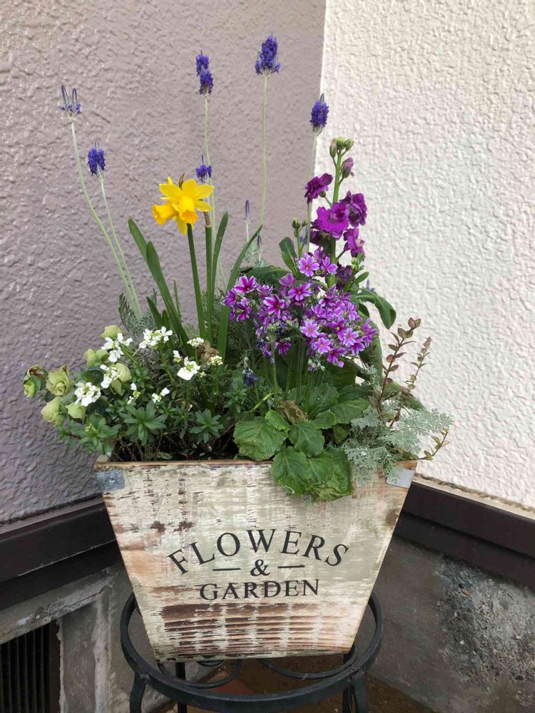 知人宅の玄関先に、すてきな鉢にレイアウトされ飾られた数種類の花に彩られ、お正月の雰囲気を感じられた。
