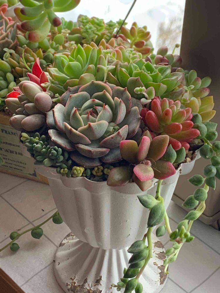 室内避難した寄せ植えは徒長気味なのと、水切りしたためセダムがカリカリ😅