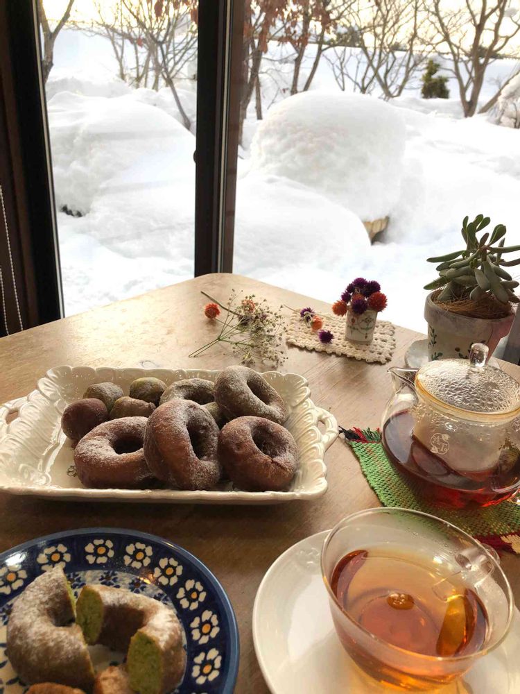 雪景色を見ながらのホッとひと休みのtea time とっても素敵に見えます🍩☕️