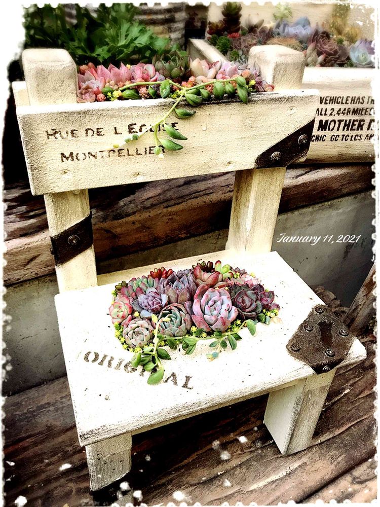 思ってるより小さいイスなので小さい苗ギュウギュウに寄せ植えたらめちゃかわいいです💖