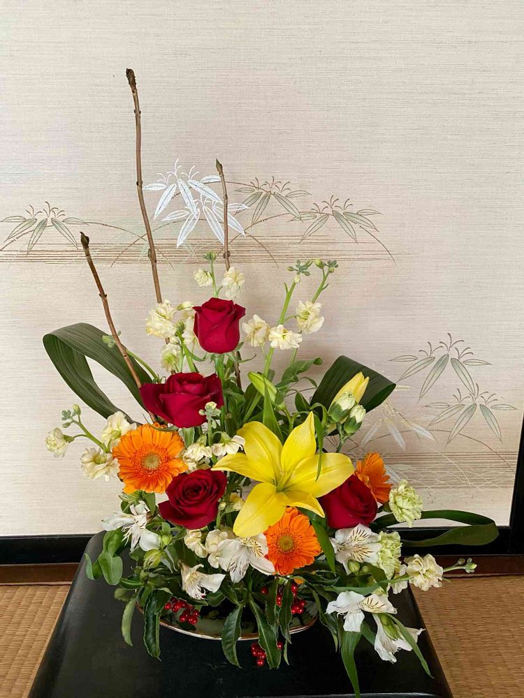 ユリ、薔薇、ガーベラ、ストック、カーネーション、アルストロメリア(コメントより教えていただきました)に、おばあちゃんちにあるハランと万両の枝と葉っぱを足して🤗