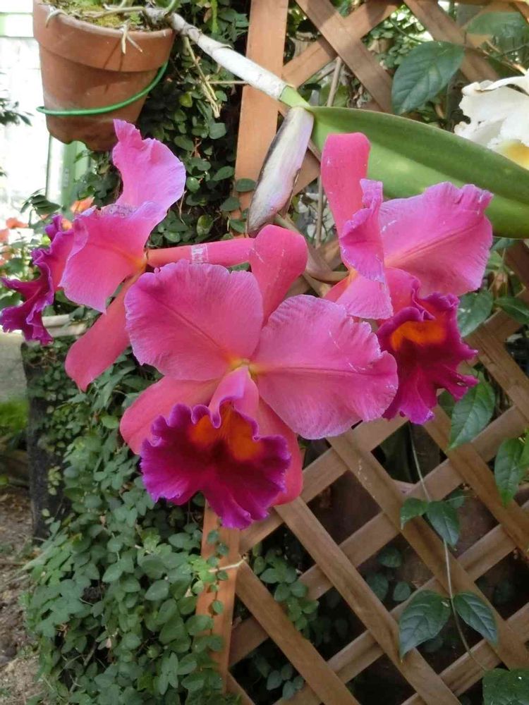 近くの植物園の温室で育てられているこの蘭はキューティガール“ヨシコ"です。鮮やかで目を引く美しい色合のカトレアです。
