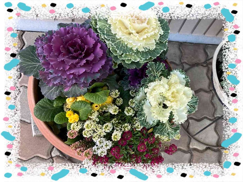 お花は出先で出会った葉牡丹の寄植え🌸