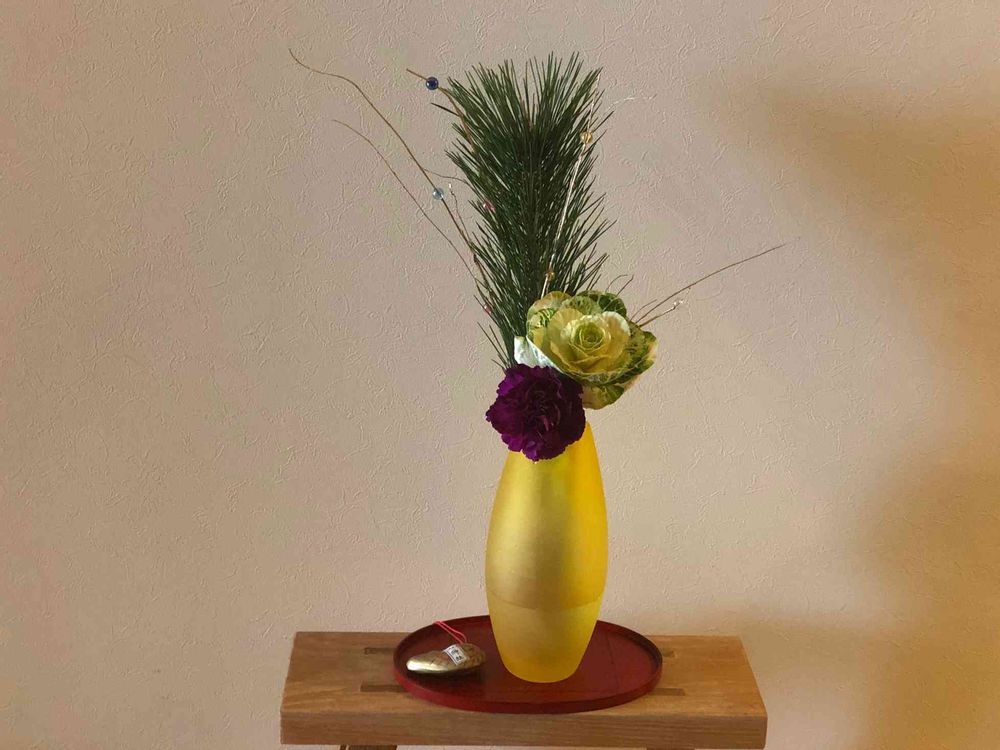 松と器が1対1、へその部分に葉ボタンとカーネーションをやや左右に振って