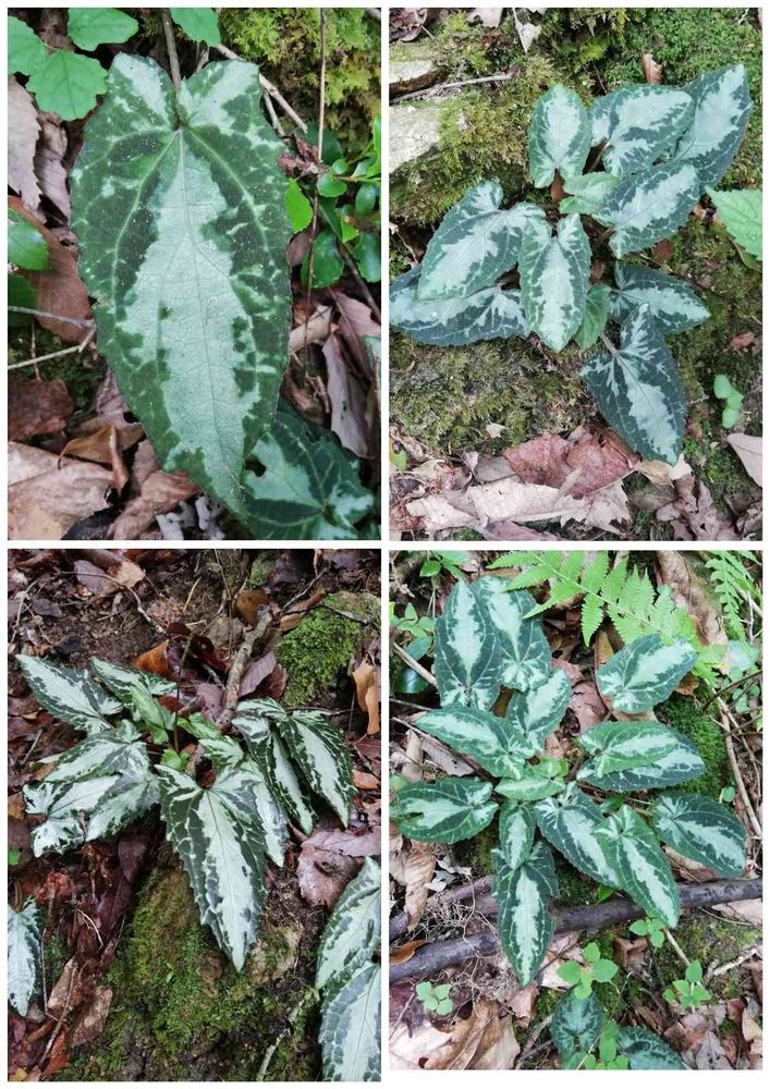 小さな谷に面した斜面に群生しています。葉は根生し、基部が大きく湾入して鉾状になります。白い斑が入り、個体個体で模様が異なり、どれも個性的です。