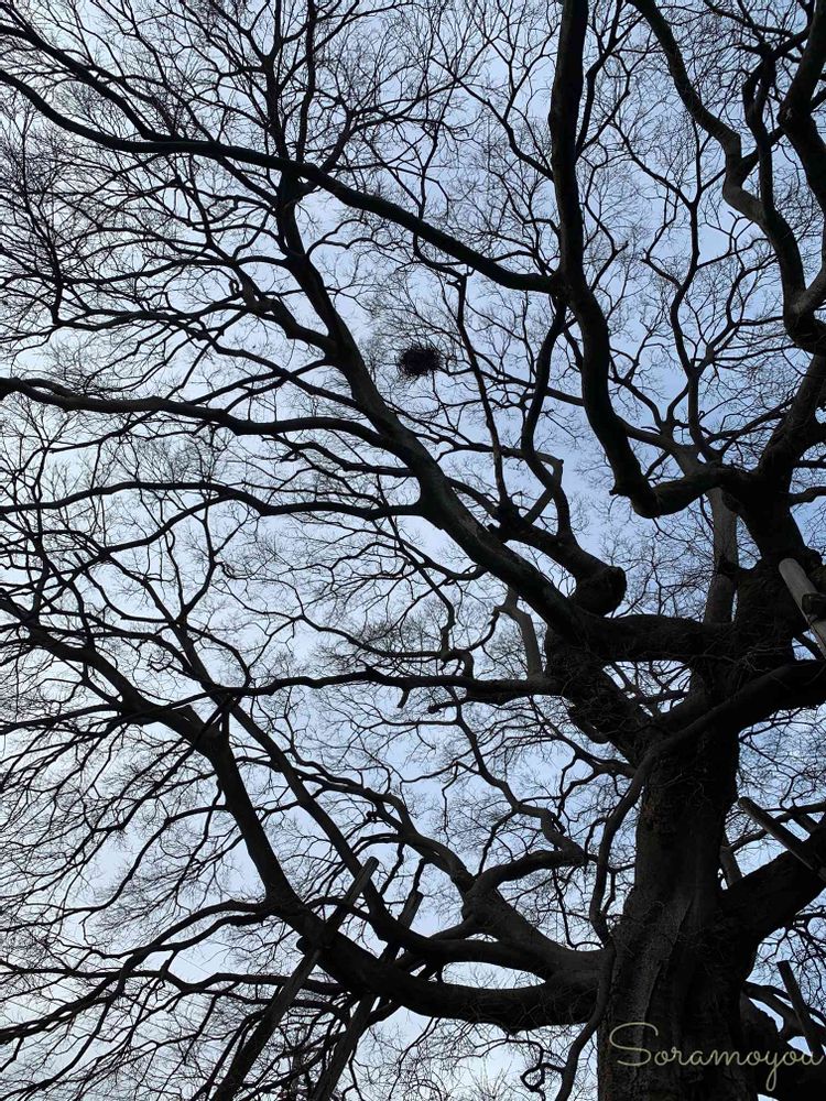 上の方にやどりぎか鳥の巣か…何か見えます。