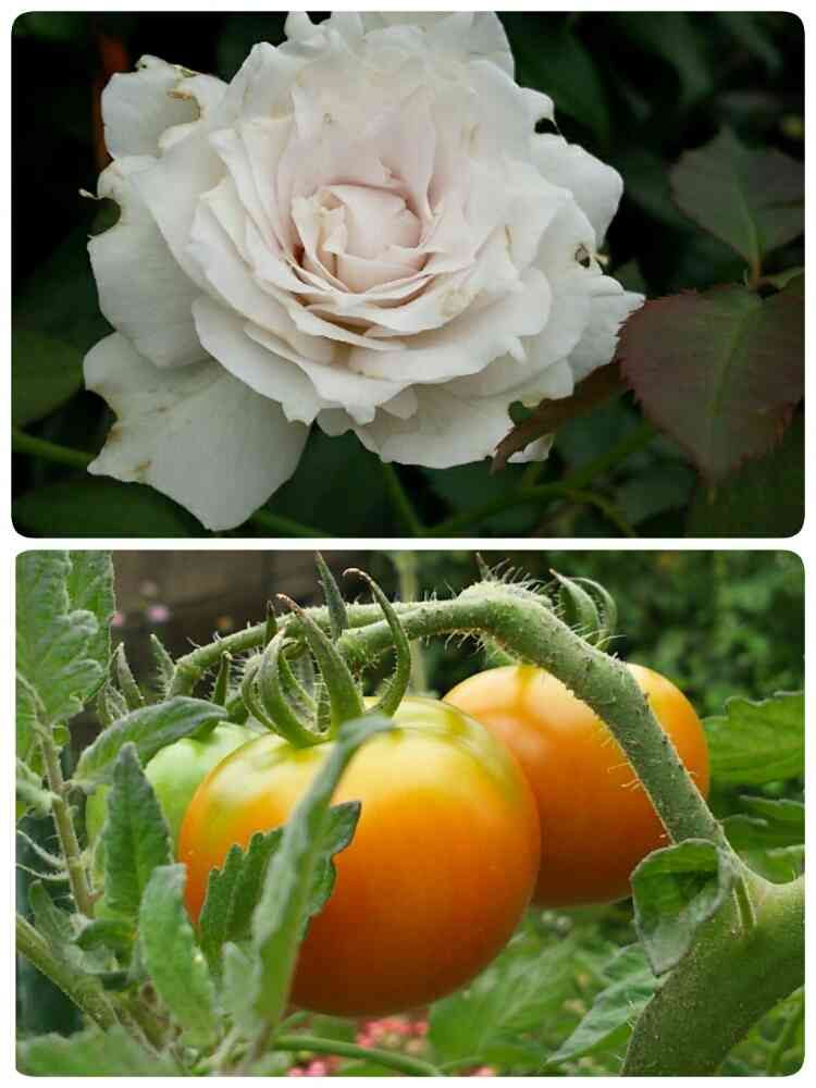 おはようございます(^^)今朝は夏が去ったような気温ですね。雨続きの夏で太陽が出るようになった途端トマトも赤く色づきました。薔薇はガブリエル🌹素敵な色と香りのガブリエルも良く成ってくれるミニトマトも大好き❤来年もこのミニトマトを植えようと思います🍅