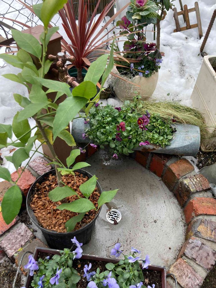お気に入りのブリキ鉢が雪の重みでへこみました😣