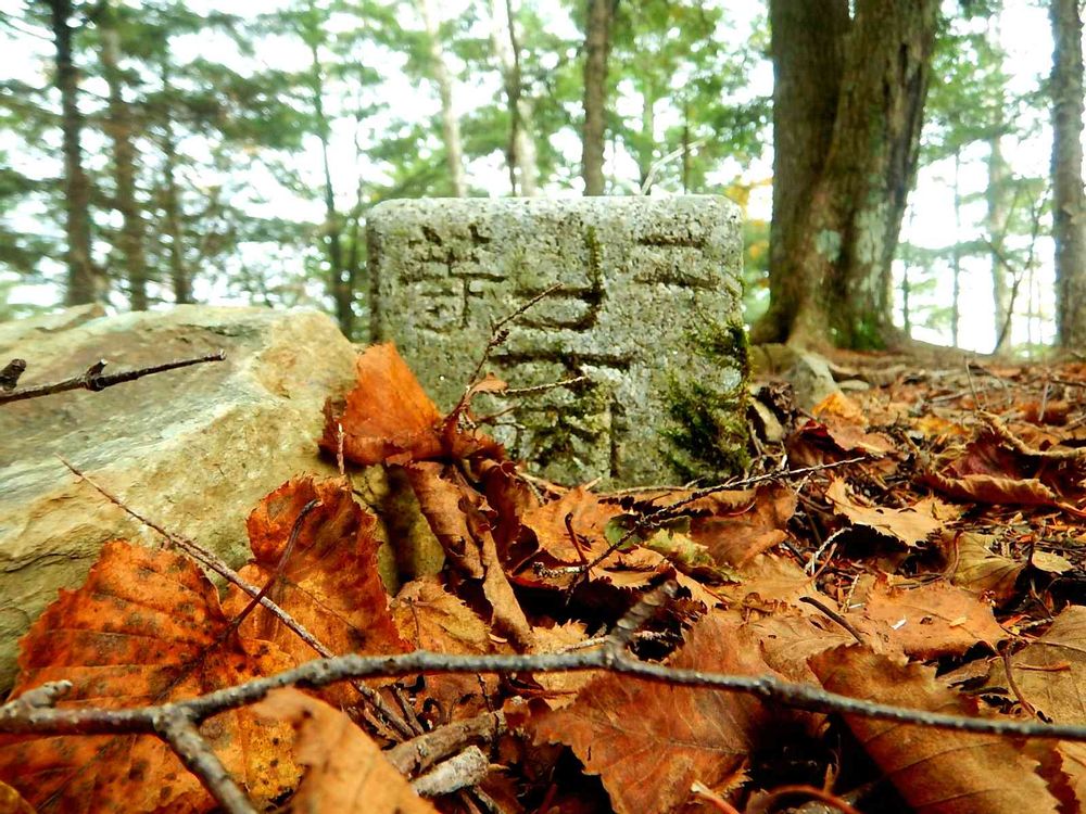 こんな写真もありましたので、見てもらえますか?三角点の隣に✕印の刻まれた石標が埋められていました。そこに、同じ葉っぱが散り敷いているように見えます。