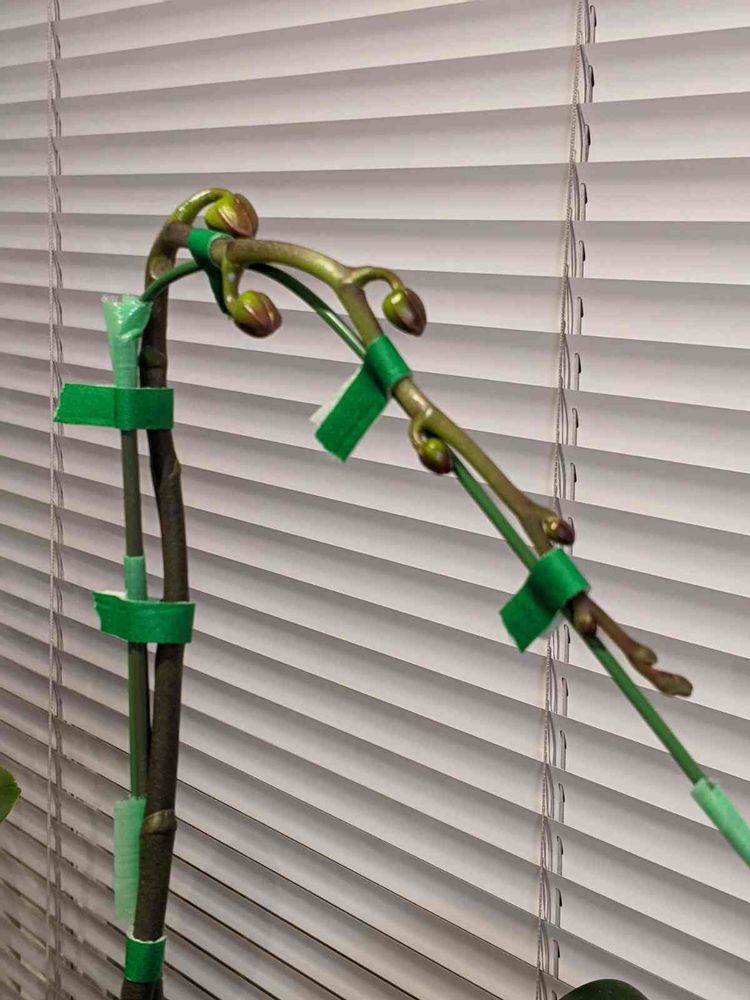 どこまで花芽が伸びるかわからないので大げさな長さの支柱してますよ😚蕾がいま8個みえてます。醍醐味とはこういう事だなと一人ほくそ笑む😏忙しさにかまけてたら花芽が伸びていてさっき慌ててテープで止めましたよ😉
