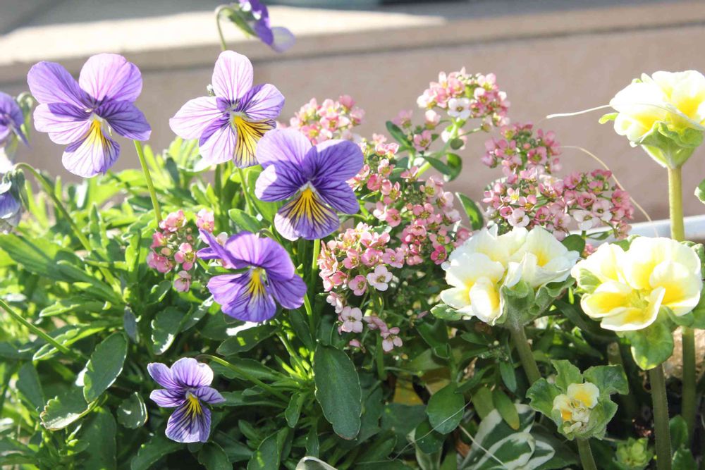 青い神戸ビオラ アリッサム プリムラの寄せ植えです😊