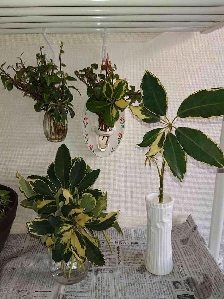 実家のシェフレラの木から剪定してきて水挿しにしました。