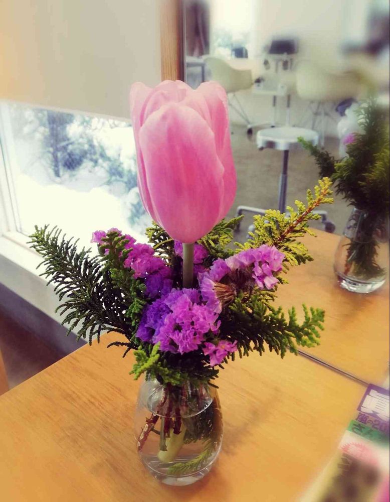 春のチュウリップに お正月の松~🎶 ピンクで可愛かった🤗