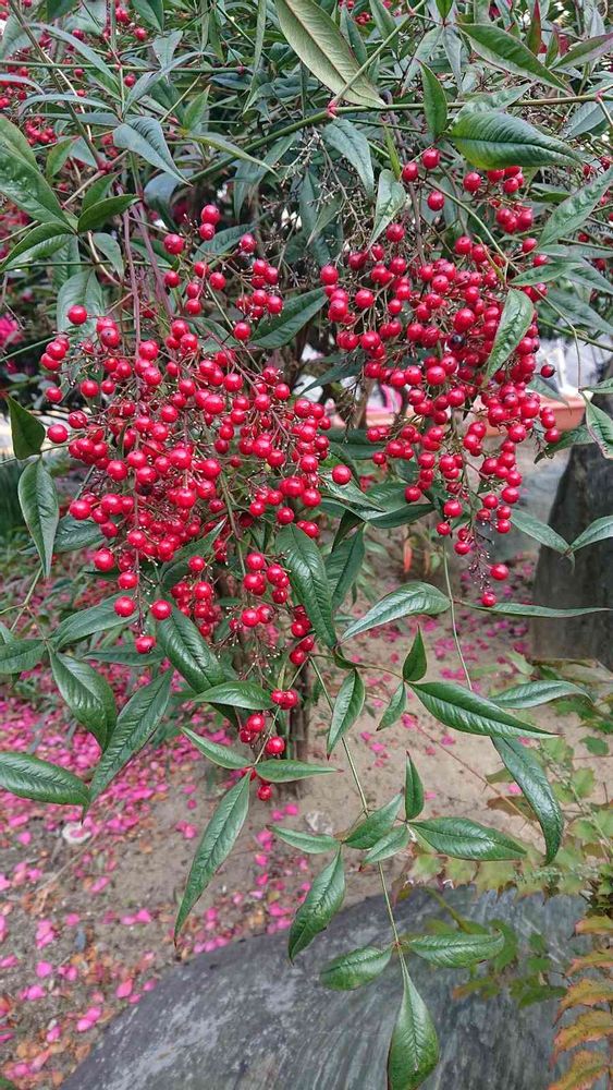 南天も綺麗ですが、ピンクの花びらは山茶花?椿?😳沢山散ってますね💦