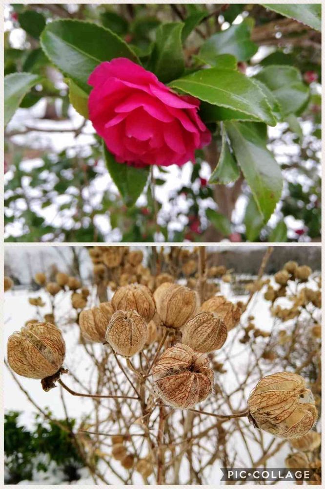芙蓉も種を見せながらも 雪色の中に可愛い色姿を見せてくれていました🤗